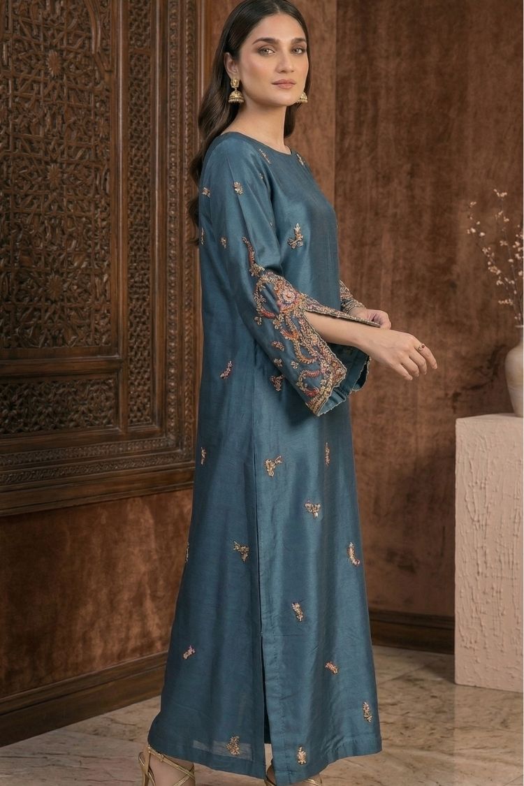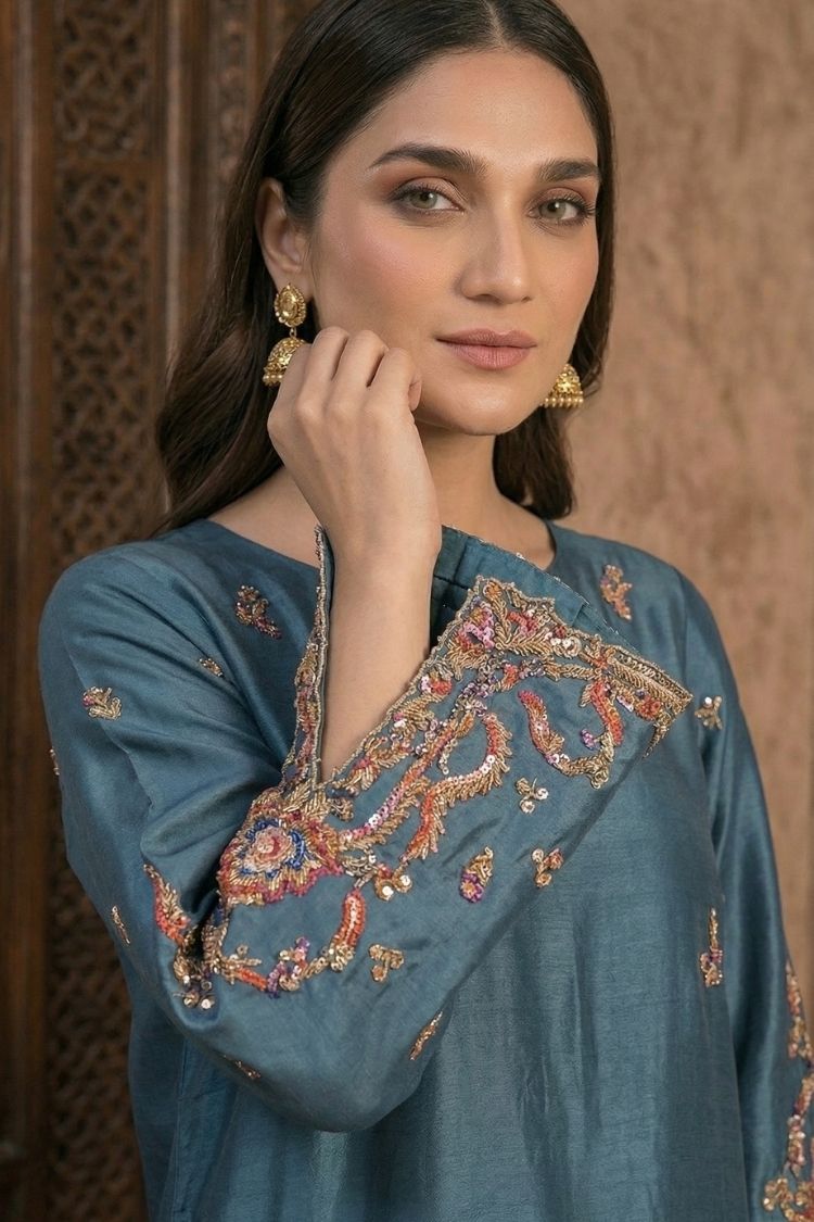 Aahang-e-Neel – Discover effortless elegance with this serene sea green raw silk ensemble. Featuring a gracefully tailored long shirt, paired with a delicate kattan organza dupatta and a luxurious Pakistani silk slip, this outfit reflects a perfect blend of sophistication and tradition. Subtle in tone yet rich in appeal, Aahang-e-Neel is an ideal choice for festive gatherings and refined celebrations.