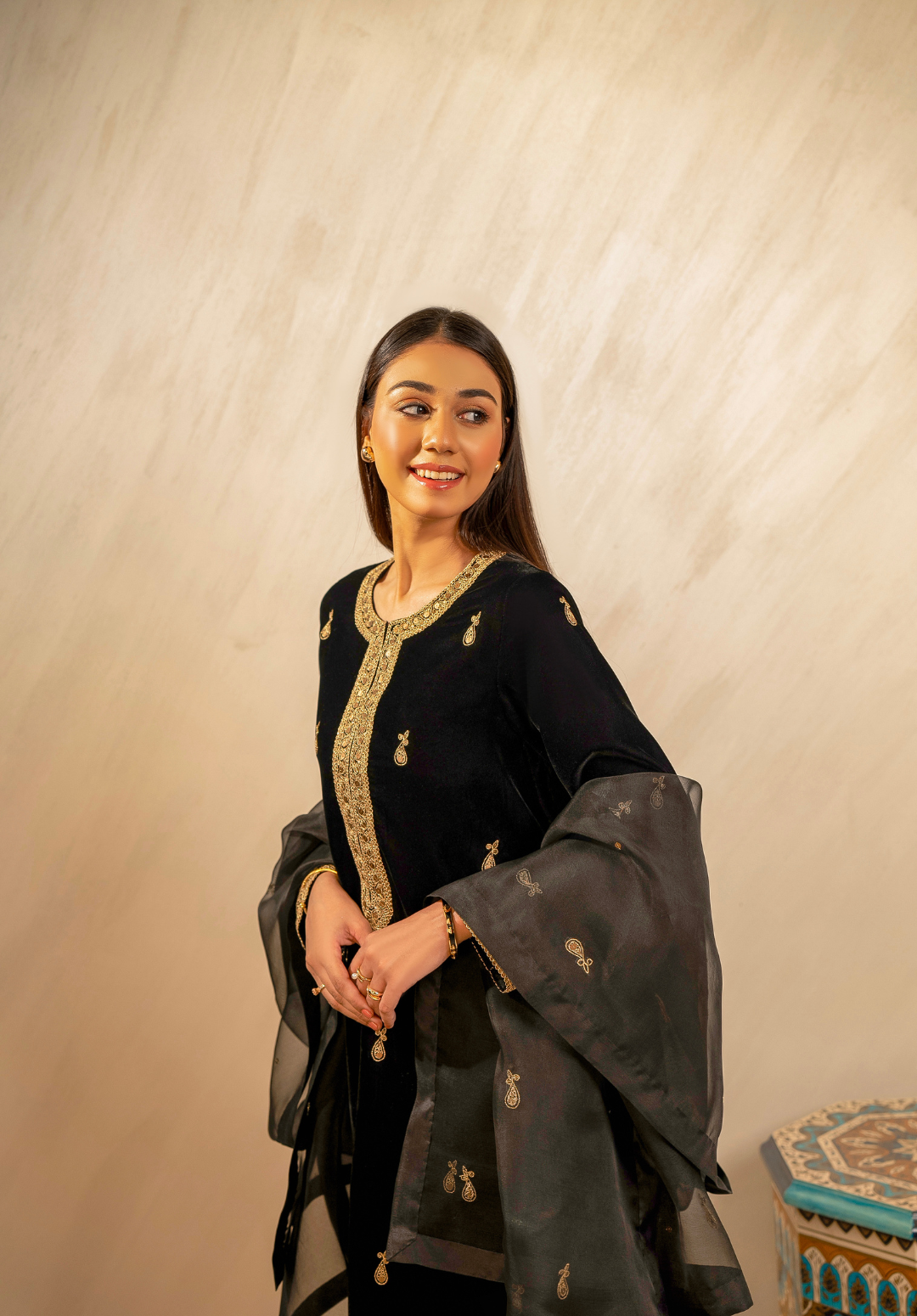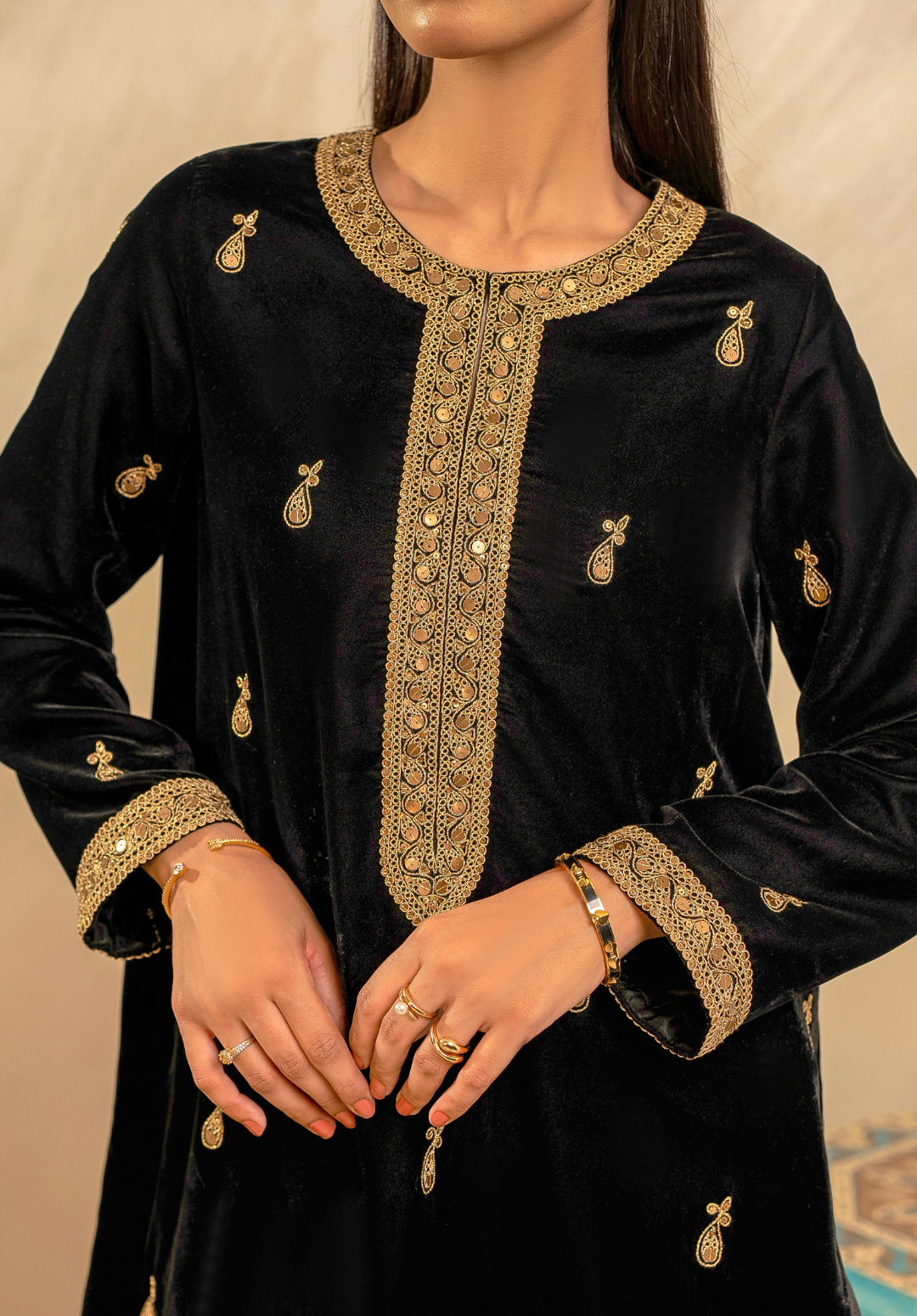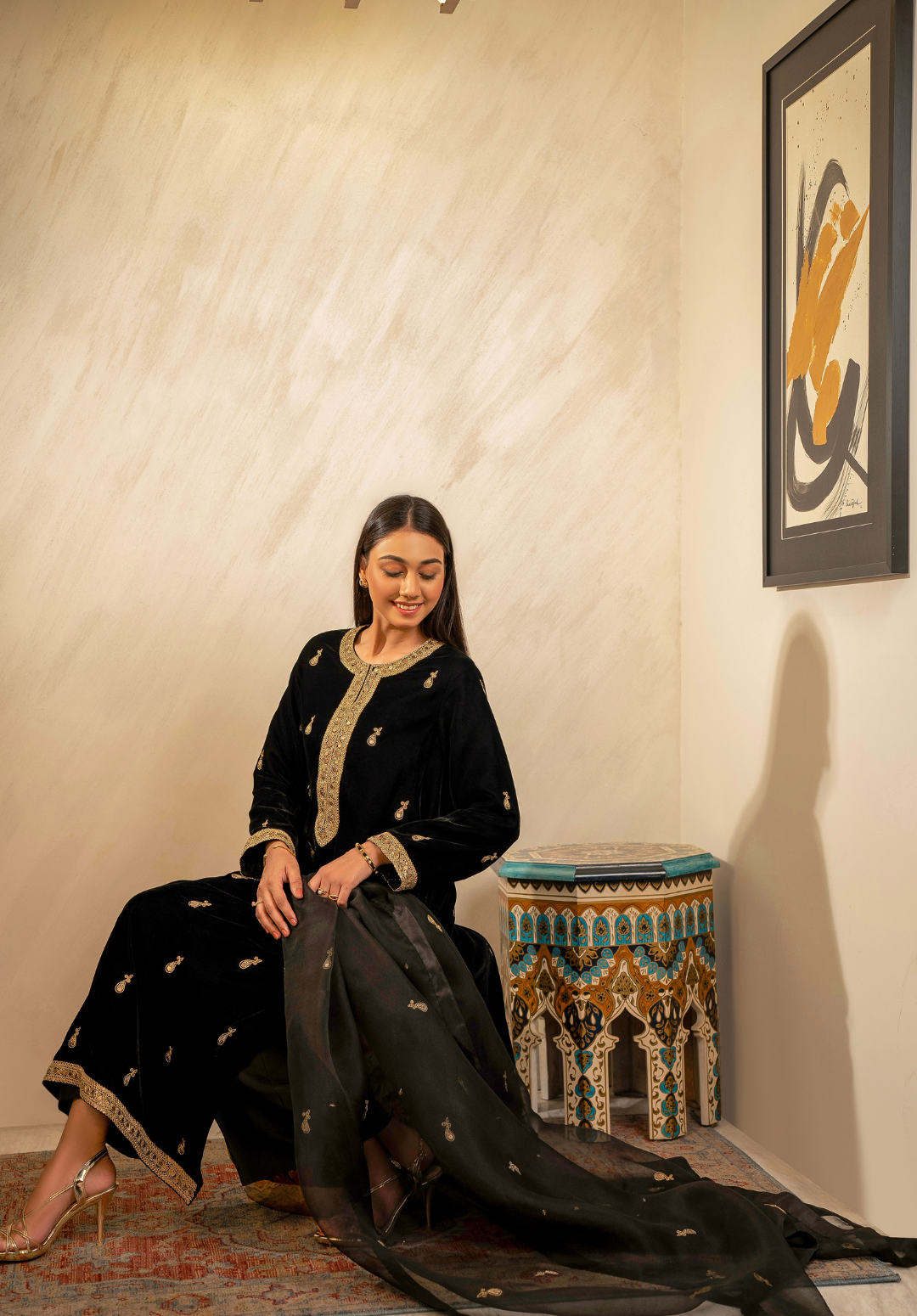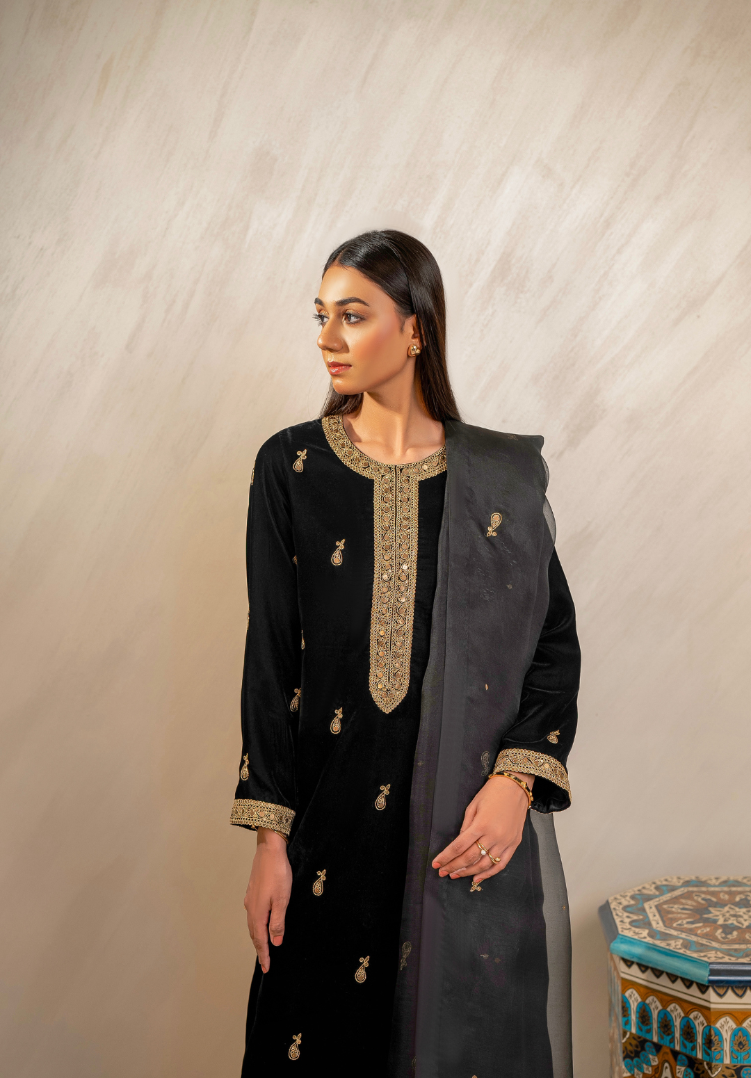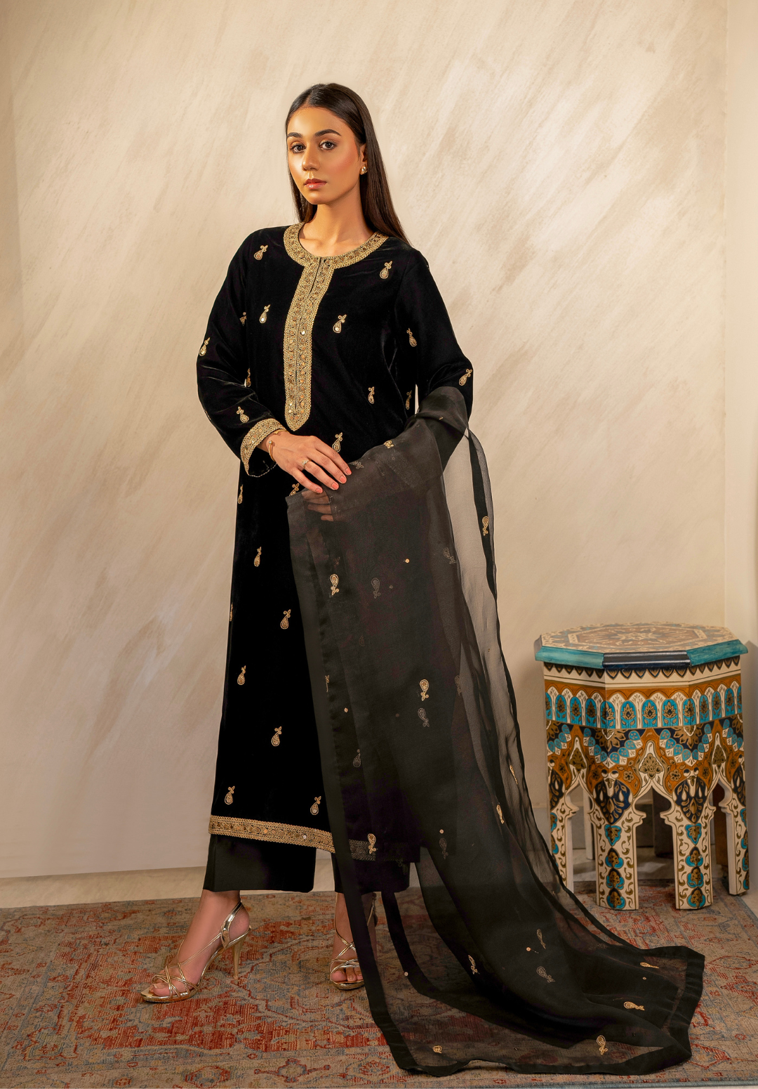 Mehfil-e-Siyah embodies the allure of midnight elegance — a timeless black velvet ensemble adorned with delicate golden embroidery that shimmers like starlight. Paired with a sheer organza dupatta edged in refined detailing, this three-piece outfit captures the essence of regal sophistication. Perfect for evening soirees and festive gatherings, Mehfil-e-Siyah celebrates grace, power, and the eternal charm of black.