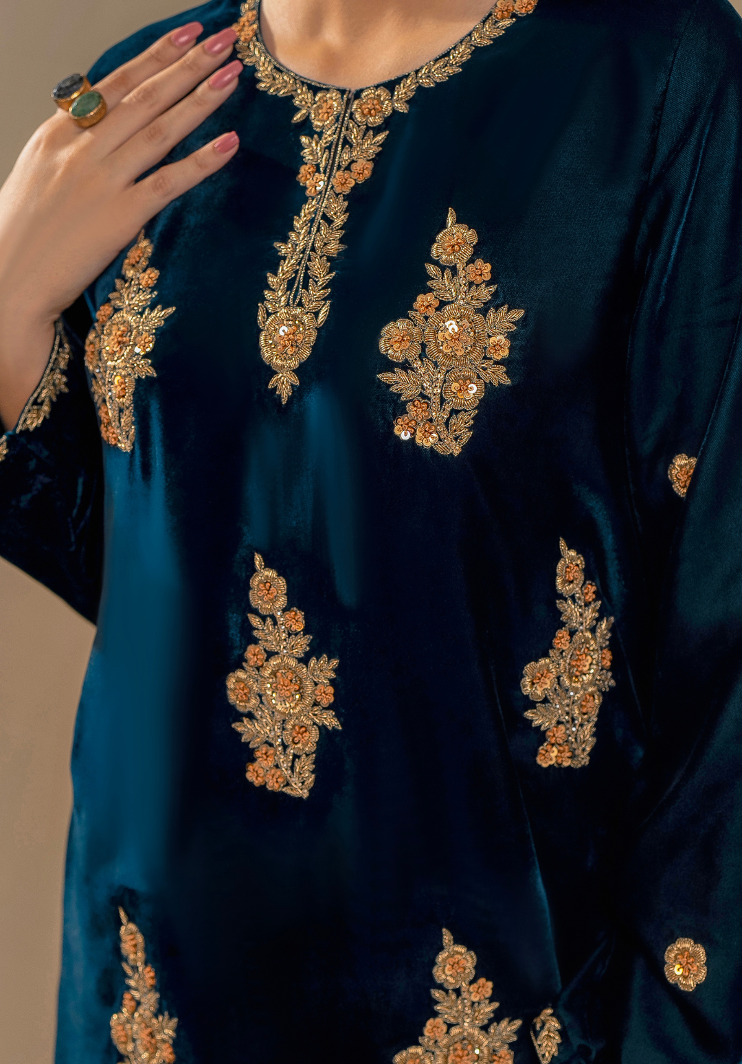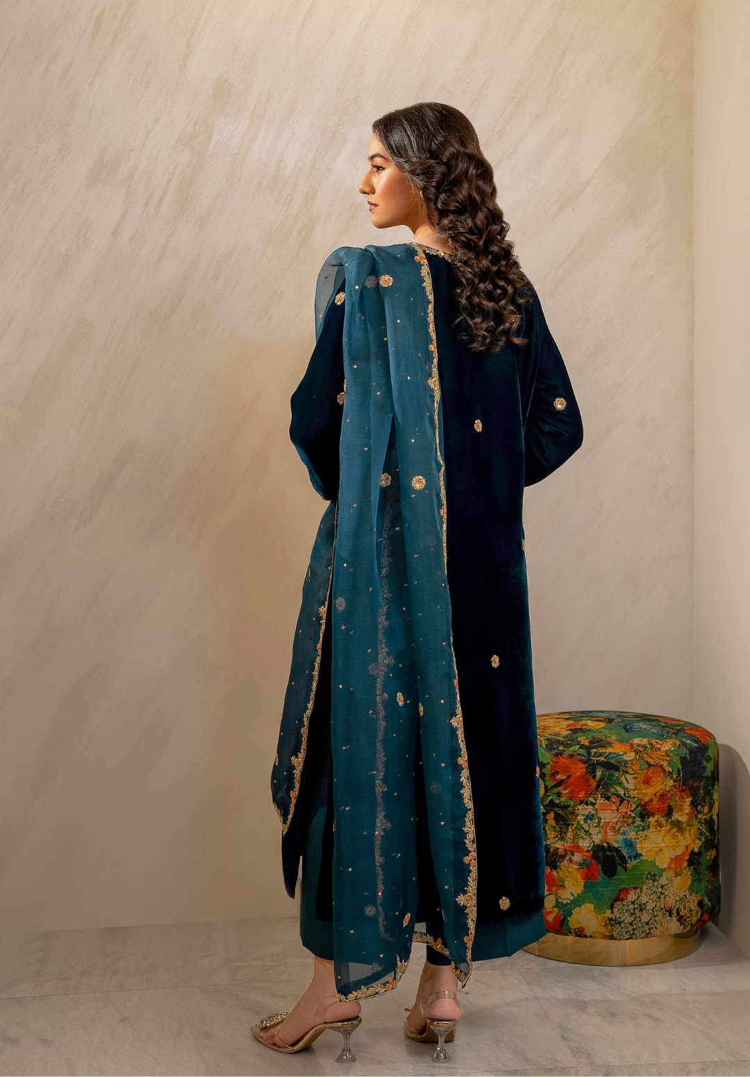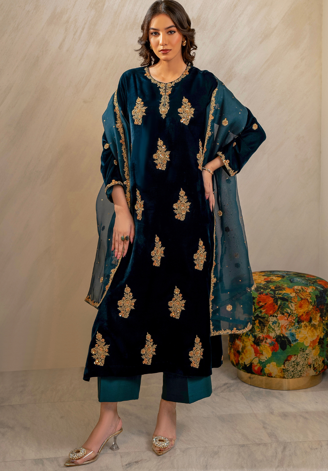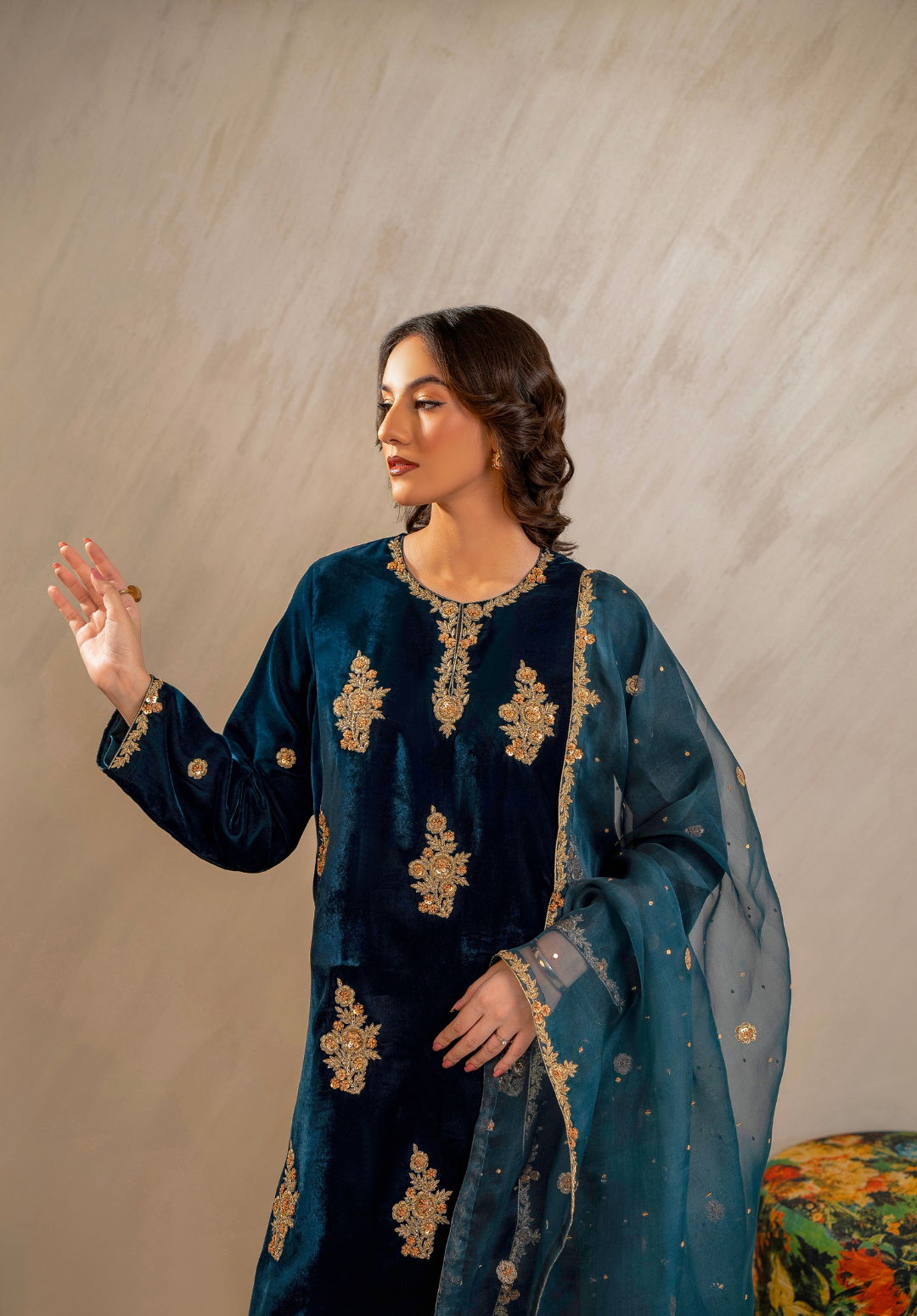 Neelam-e-Husn reflects regal elegance in every detail — a stunning deep blue-green velvet ensemble adorned with intricate golden embroidery that radiates opulence. Paired with a soft blue-green organza dupatta, the outfit exudes an air of graceful sophistication. Perfect for festive evenings and winter celebrations, Neelam-e-Husn embodies timeless beauty with a modern royal allure.