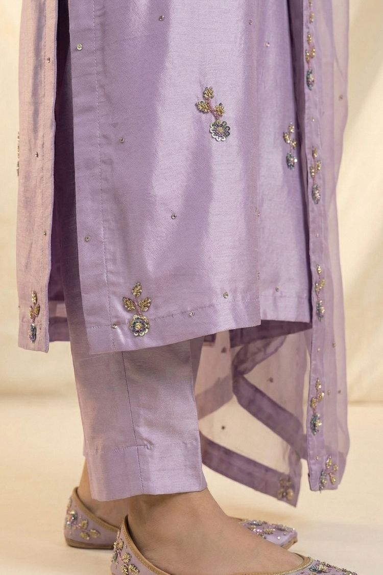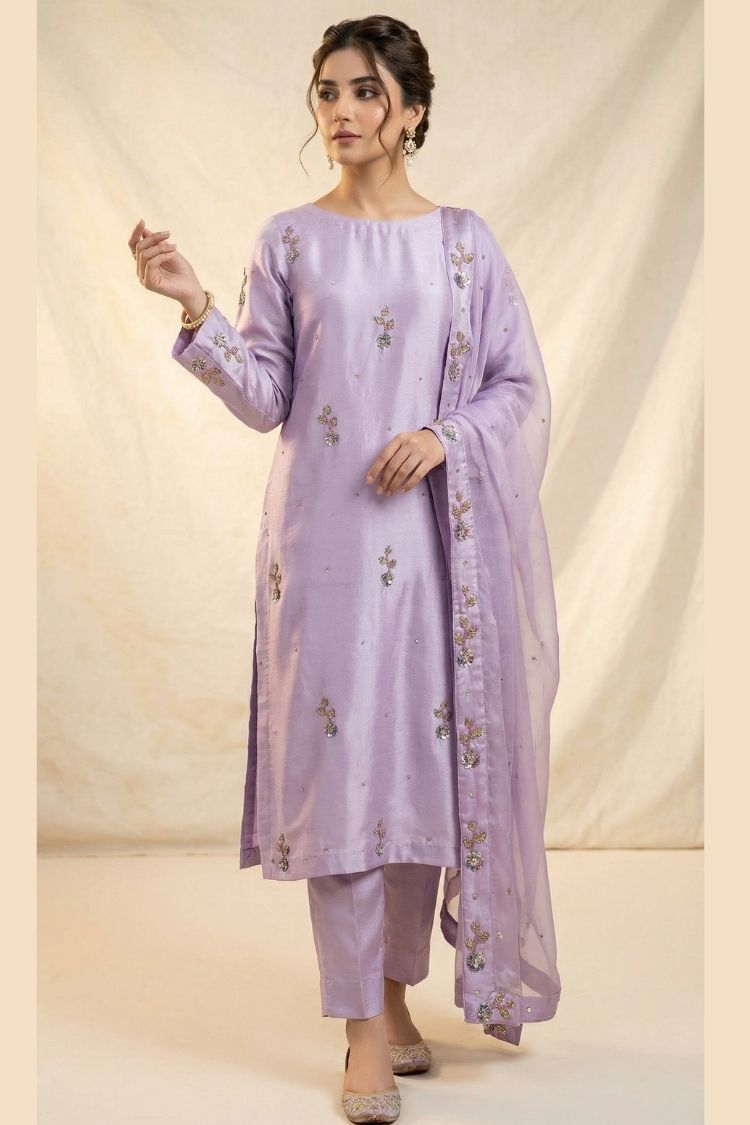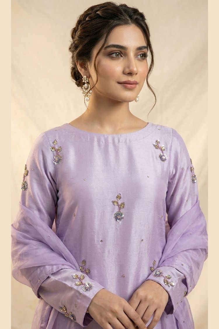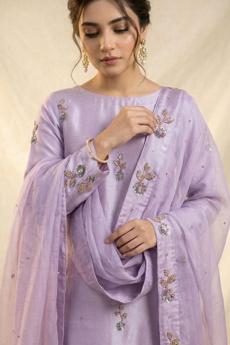 Purple Haze – A soft expression of modern elegance, this light purple ensemble is crafted in premium raw silk with a gracefully tailored long shirt that flows with subtle sophistication. It is paired with a delicate kattan organza dupatta and a smooth Pakistani silk slip, creating a refined harmony of texture and comfort. The soothing lavender tone brings a dreamy, ethereal charm, making it a perfect choice for festive gatherings and elegant occasions. Purple Haze embodies femininity, grace, and understated luxury in every detail.