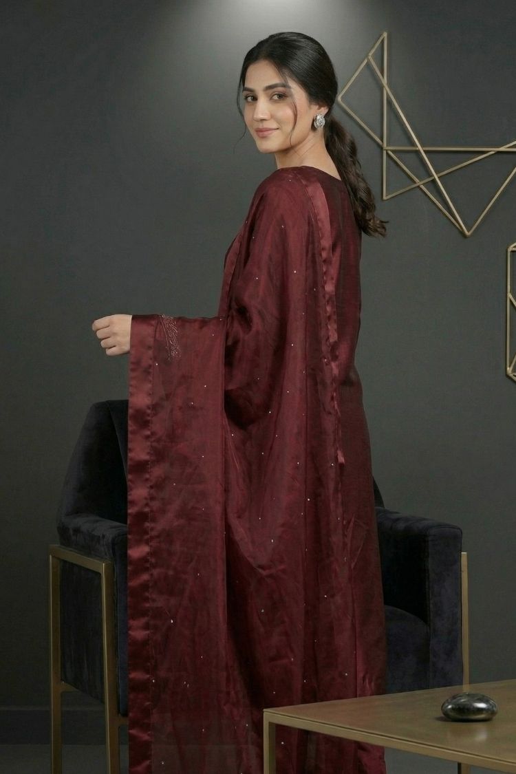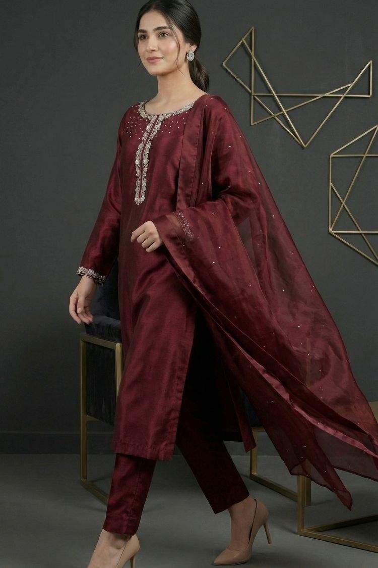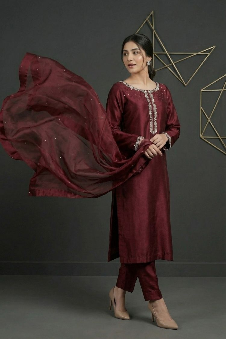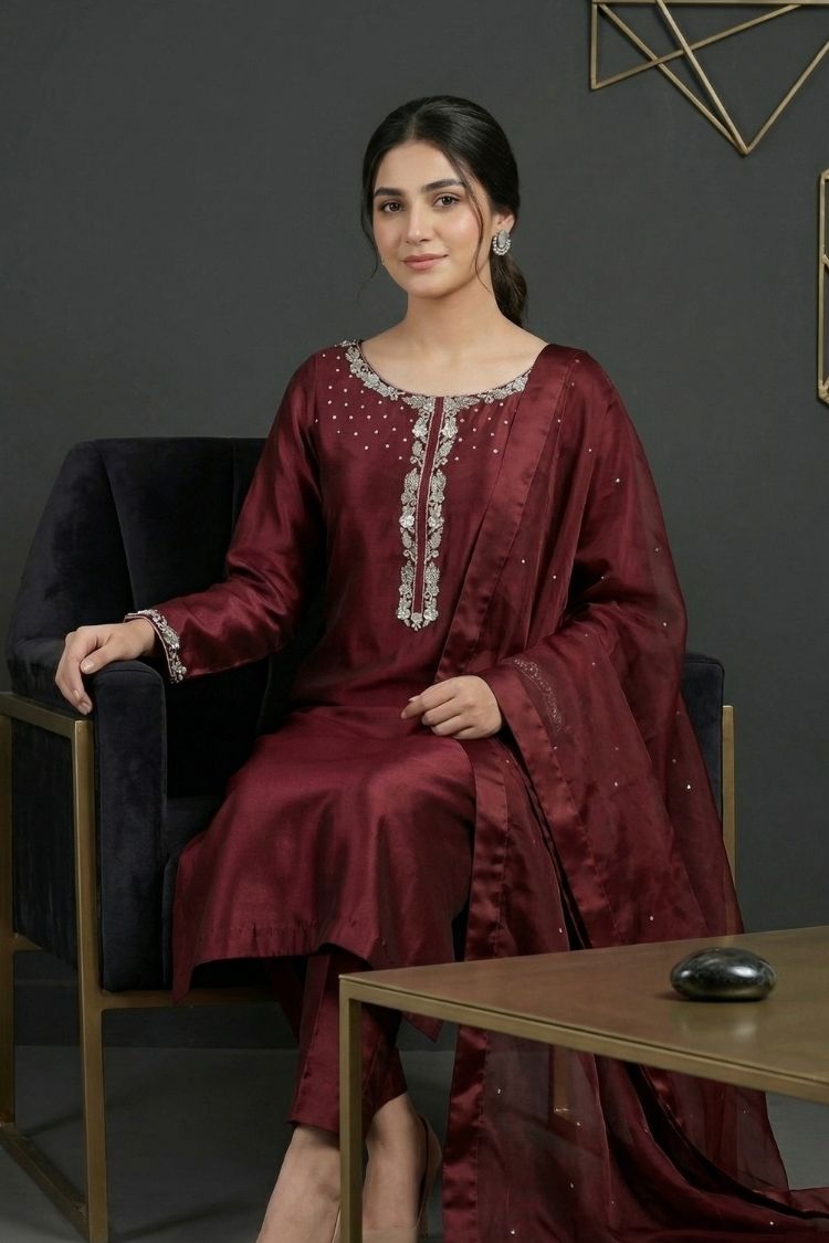 Shaam-e-Surkh – A rich celebration of deep maroon elegance, this raw silk ensemble is designed with a gracefully tailored long shirt that reflects timeless sophistication. It is paired with a delicate kattan organza dupatta and a smooth Pakistani silk slip, offering a refined blend of comfort and luxury. The deep crimson hue evokes the beauty of a dusky evening sky, making it a perfect choice for festive and formal occasions. Shaam-e-Surkh embodies warmth, grace, and classic tradition in every detail.