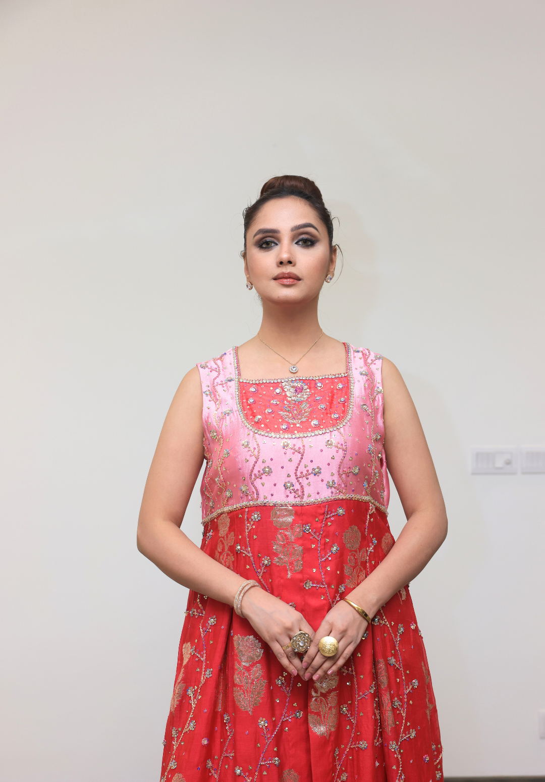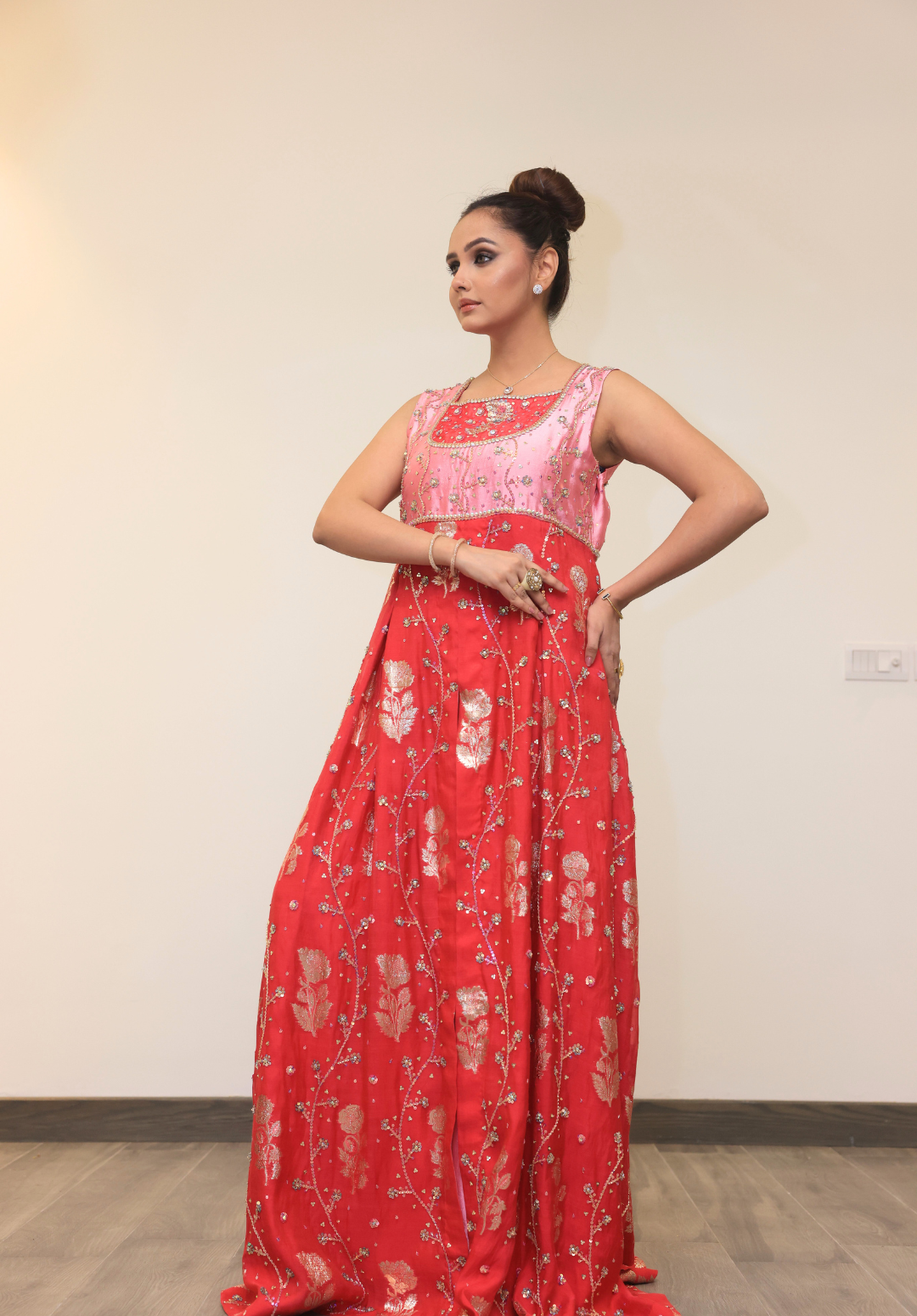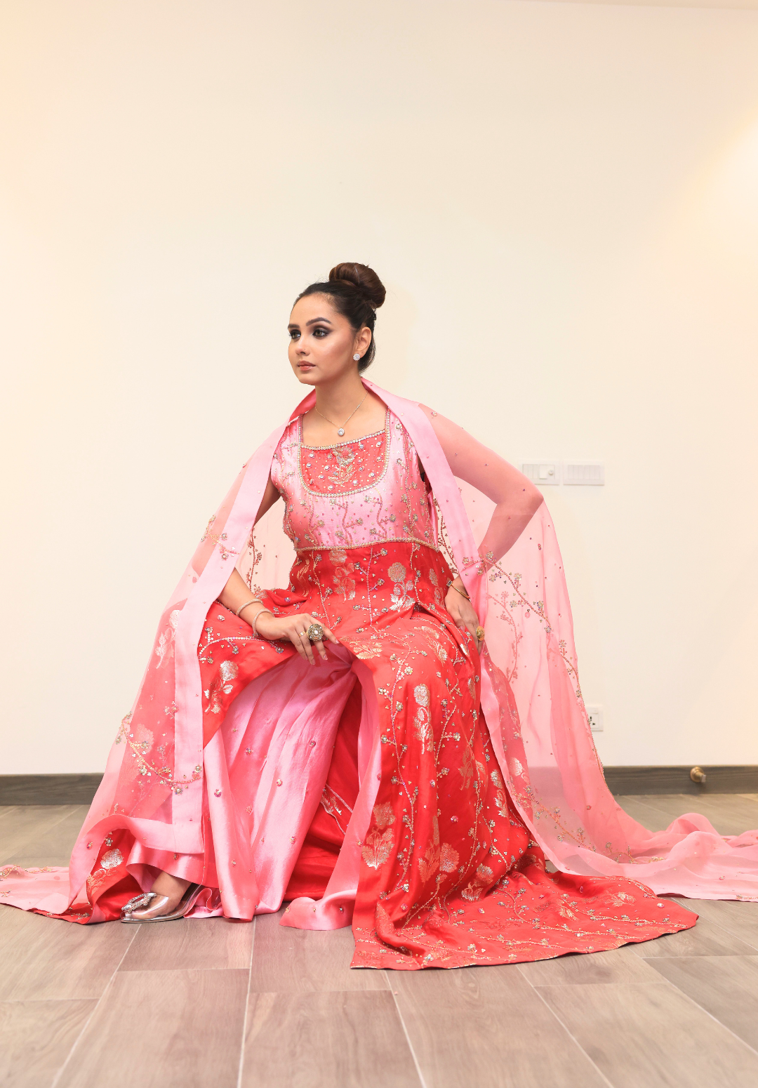 Shafaq — From Farhi Bhullar Couture’s Kashish Collection, this breathtaking shocking pink ensemble captures the essence of modern opulence. The lavish star embroidery shimmers across the fabric, creating a celestial spectacle that exudes grandeur. Paired with a delicate baby pink net silk dupatta, the contrast adds softness to the bold hue, resulting in a look that’s both radiant and refined. A true statement of luxury, Shafaq is designed for the woman who loves to shine unapologetically.