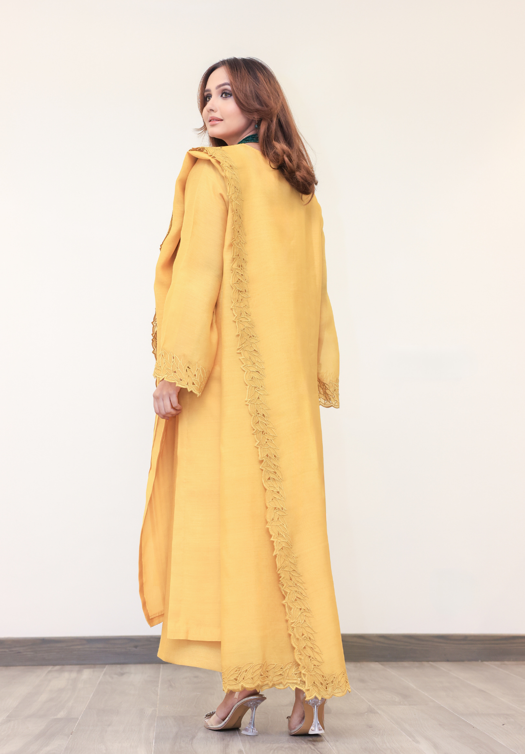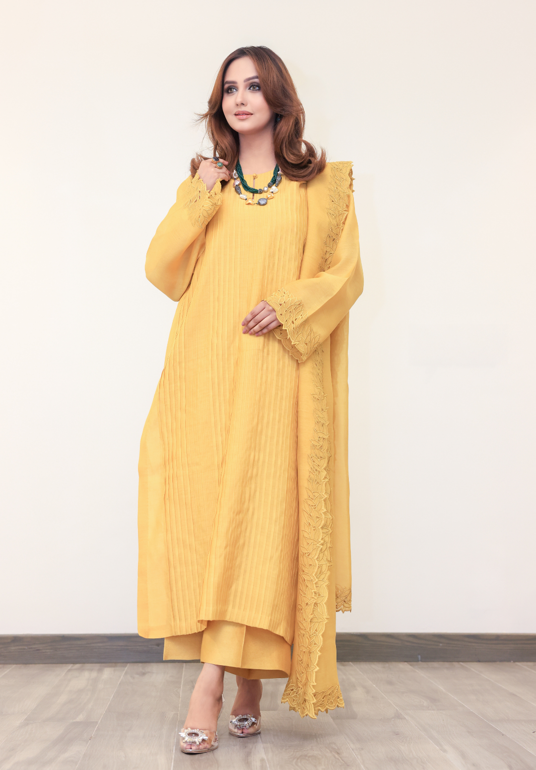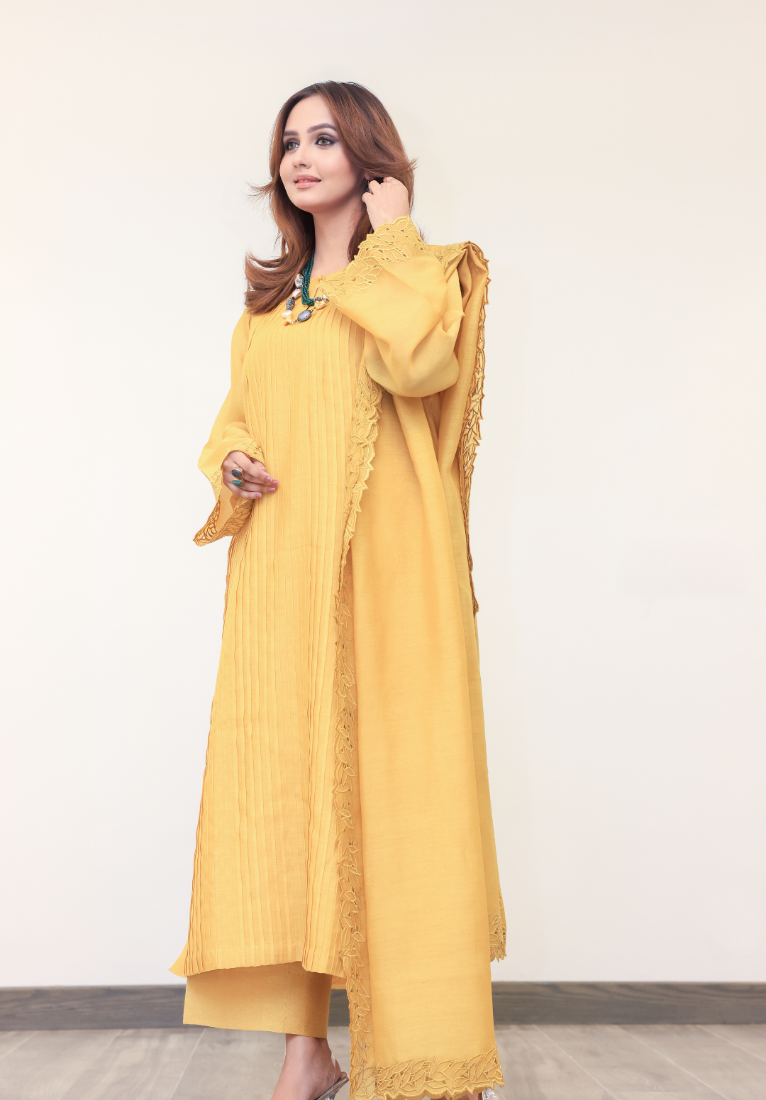 Sunehri is a radiant two-piece ensemble in a striking bright yellow, crafted from lightweight paper lawn. The vibrant hue brings a refreshing burst of energy, while the sleek shirt paired with plain trousers keeps the look effortlessly elegant. Perfect for daytime gatherings and semi-formal occasions, this outfit captures the essence of lively sophistication.