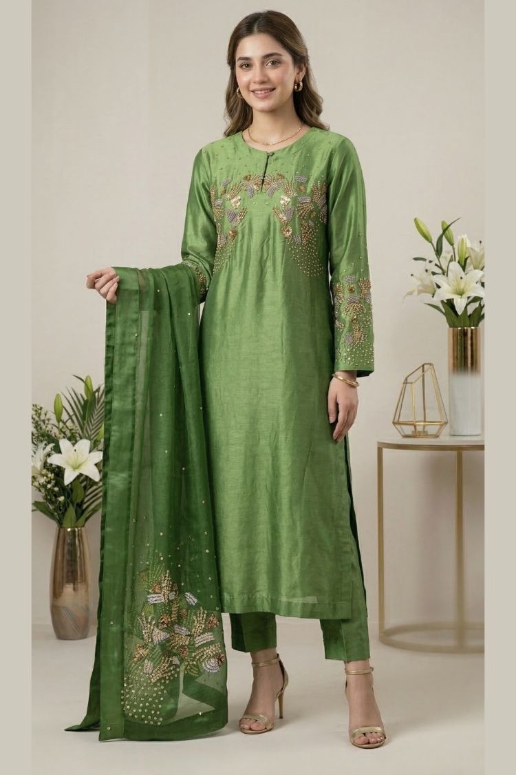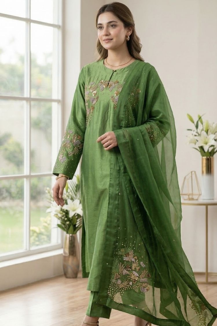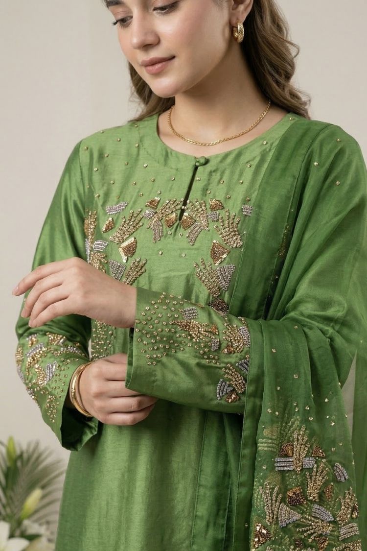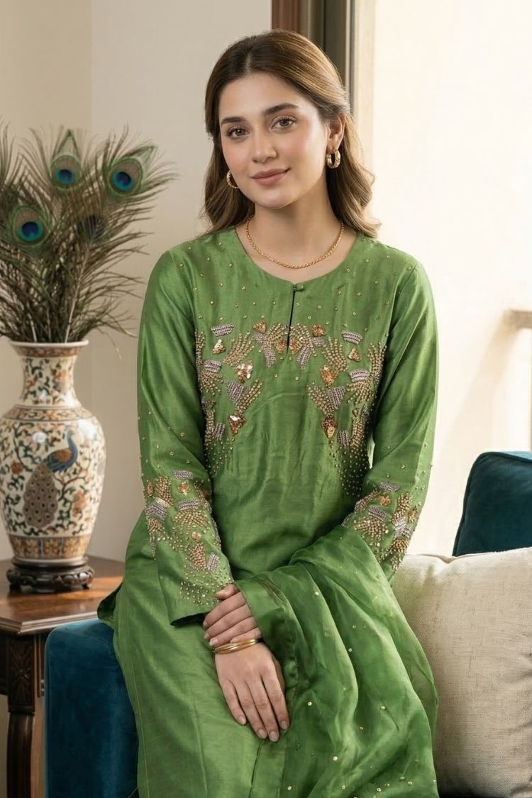 Zari Gul – A refreshing take on festive elegance, this parrot green shisha silk ensemble is designed with a flowing long shirt that exudes grace and charm. It is paired with a soft kattan organza dupatta and a smooth Pakistani silk slip, creating a lightweight yet luxurious feel. The vibrant hue reflects freshness and celebration, while its refined silhouette keeps the look effortlessly sophisticated. Zari Gul is crafted for those who love tradition with a bright, modern spirit.